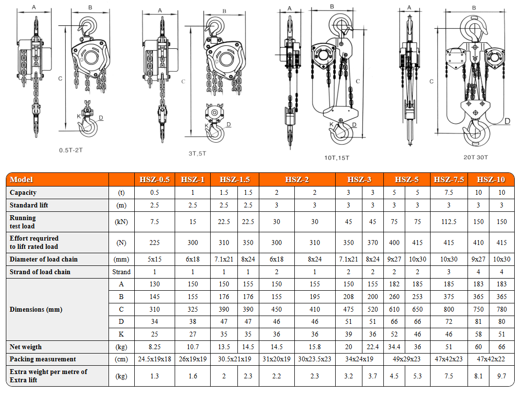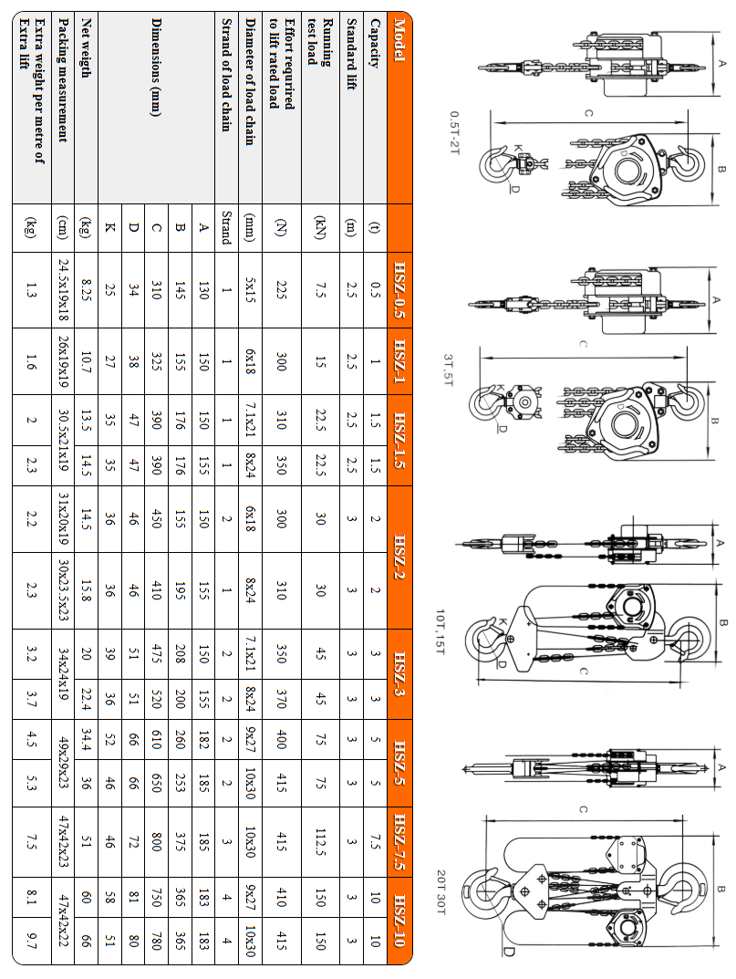 | Diameter of load chain | mm | 5×15 | 6×18 | 7.1×21 | 8×24 | 6×18 | 8×24 | 7.1×21 | 8×24 | 9×27 | 10×30 |