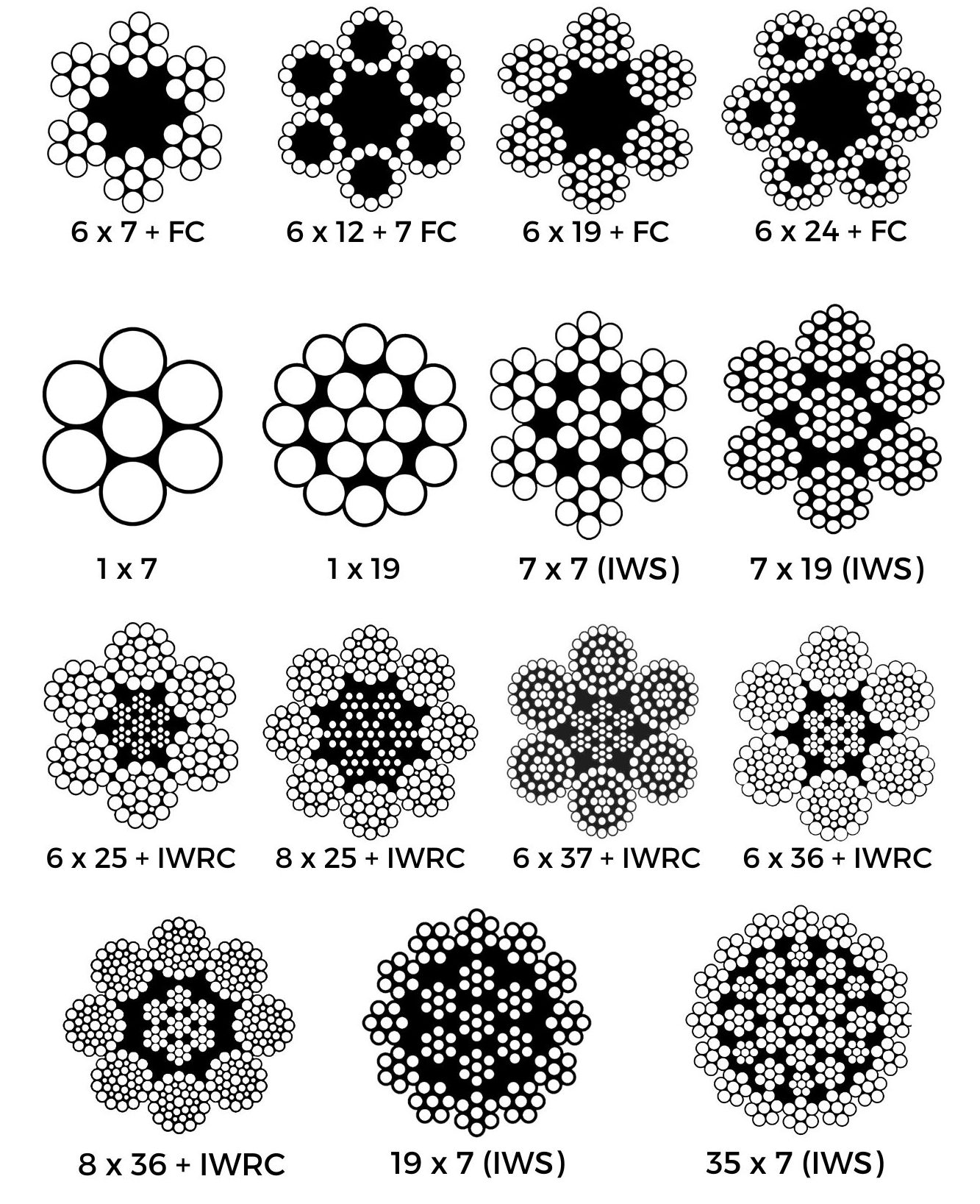 - รูปแบบทั่วไป: เช่น 6×19, 6×36, 7×7 และ 7×19 (ตัวเลขข้างหน้าแสดงจำนวนเกลียวและข้างหลังแสดงจำนวนลวดในแต่ละเกลียว)